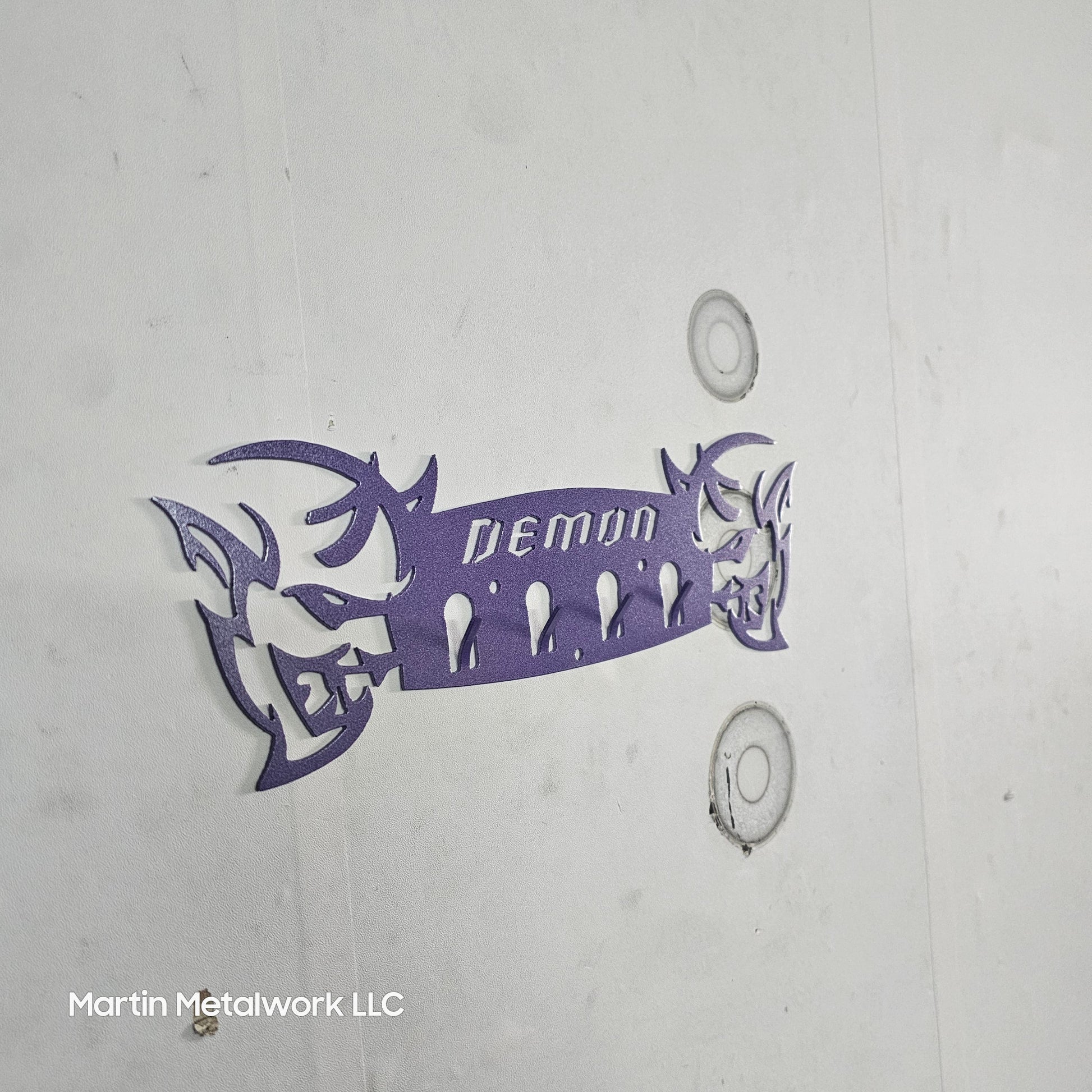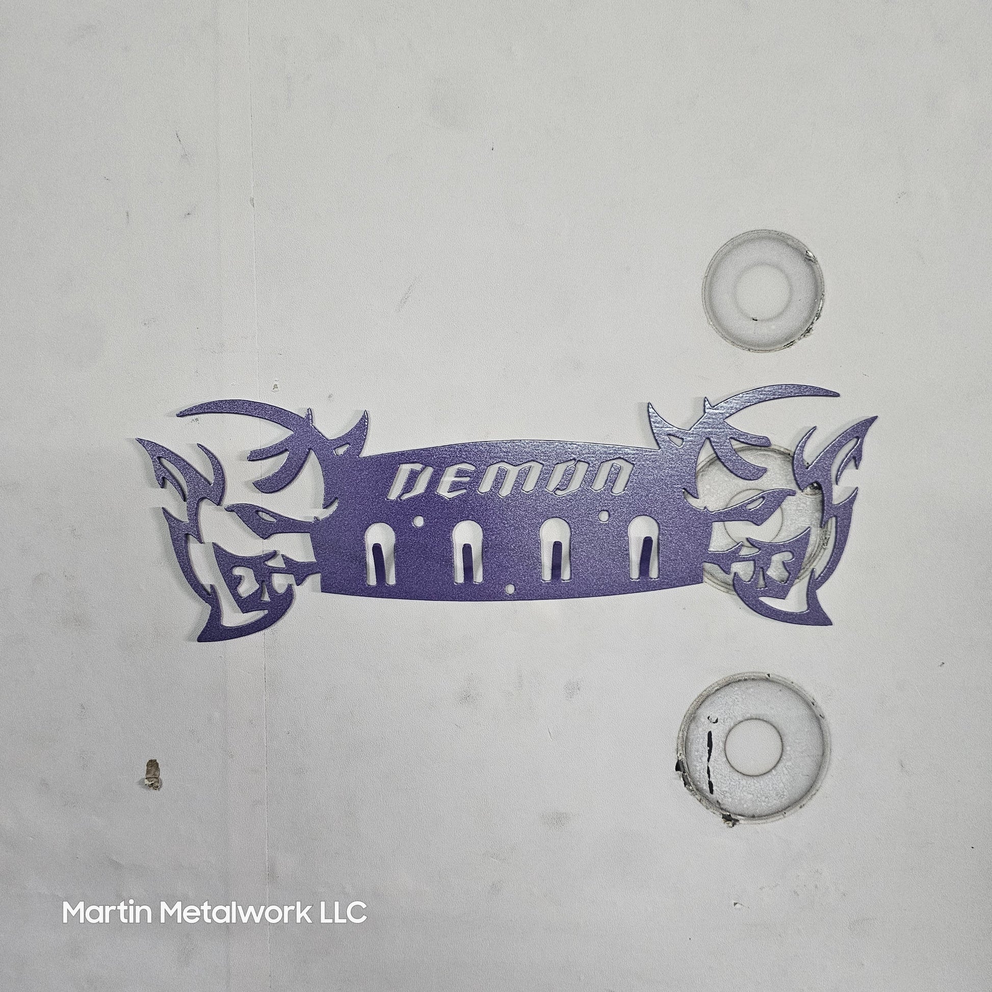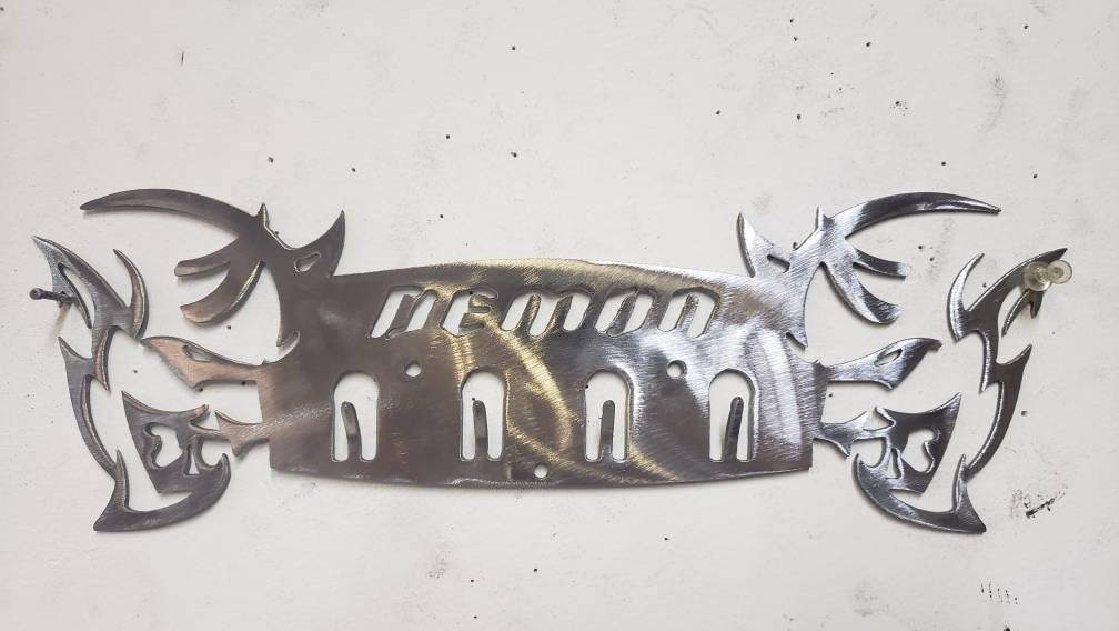 Bring muscle car attitude to your space with this demon-inspired key hanger. Precision cut from 14-gauge steel and powder coated for a bold, durable finish, this wall-mounted rack is perfect for organizing keys, lanyards, or small accessories. Measuring 12" wide by 4" tall with four strong hooks, it’s ideal for the garage, entryway, man cave, office, or mudroom.