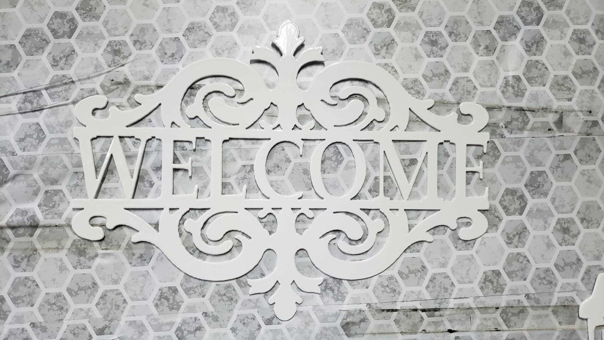 Upgrade your entryway with a touch of class! This elegant metal welcome sign is designed to greet guests with style, whether it’s hung on your porch, front door, or entry hall. Each sign is plasma cut from durable 14-gauge steel for intricate, fancy lettering and detailed flourishes, then finished with a protective powder coat in your color of choice. Designed for all-weather outdoor use, but equally stunning indoors.