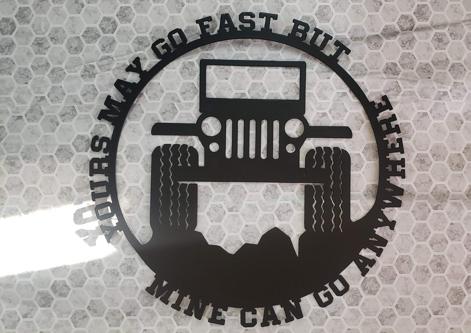 Show off your love for off-roading and Jeep adventure with this bold 16x16 inch wall art! Featuring a classic Jeep silhouette climbing a hillside with the phrase “Yours May Go Fast, But Mine Can Go Anywhere,” this statement piece is plasma cut from tough 14-gauge steel and finished in your choice of powder coat color for durability and style. Perfect for garages, man caves, workshops, or any space where you want to add some rugged 4x4 personality.