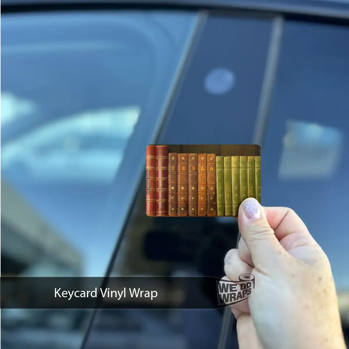 Like reading? Well read this, you should probably get this entertaining Tesla Keycard wrap of some fancy looking old books, appropriately organized on a shelf.